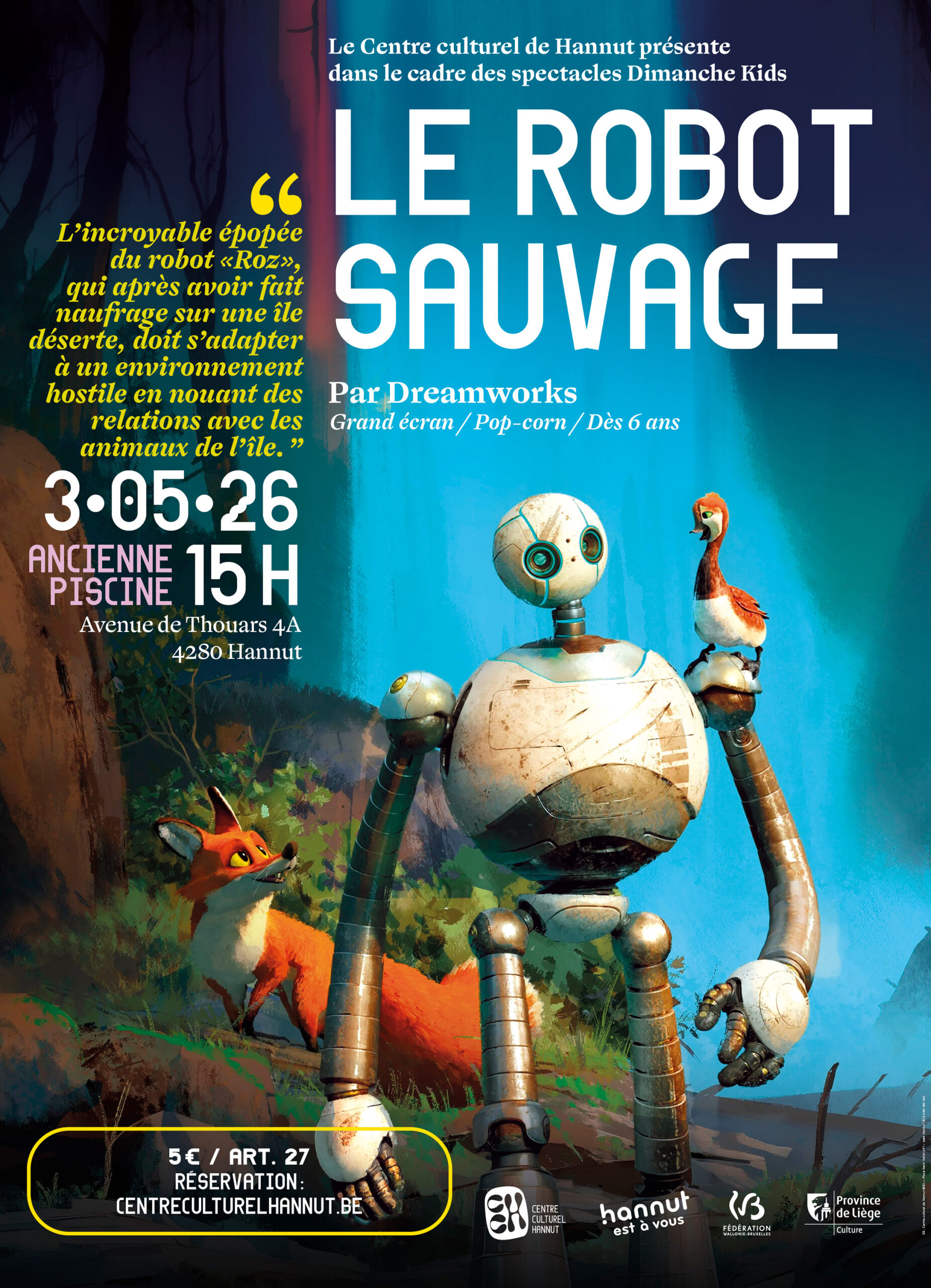 Le Robot Sauvage Date 3 Mai 2026 Heure 15 h 00 min - 17 h 00 min Lieu Ancienne Piscine Hannut Catégorie Cinéma Organisateur Centre Culturel Email info@centreculturelhannut.be RechercherRechercherArticles récents! IMPORTANT ! Grèves 25 et 26/11 Reprise des cours 2025-2026 Inscriptions 2025-2026 Horaires 2025-2026 Commentaires récentsAucun commentaire à afficher.